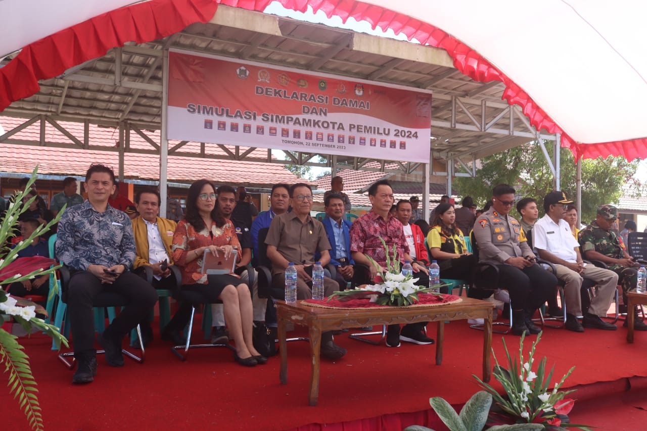 TOMOHON-SM Walikota Tomohon Caroll J. A. Senduk SH. menghadiri Deklarasi Damai dan Simulasi Sispamkota dalam rangka pengamanan Pemilu Serentak Tahun 2024, bertempat di lapangan olahraga Kelurahan Wailan Tomohon Utara, Jumat (22/9/2023).