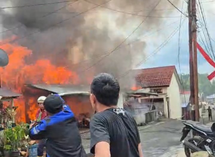 TOMOHON-SM. Empat rumah di Kelurahan Kolongan, Tomohon Tengah, ludes terbakar siang tadi, Selasa (2/9/2025). Peristiwa ini memicu kepanikan warga yang berhamburan keluar rumah.