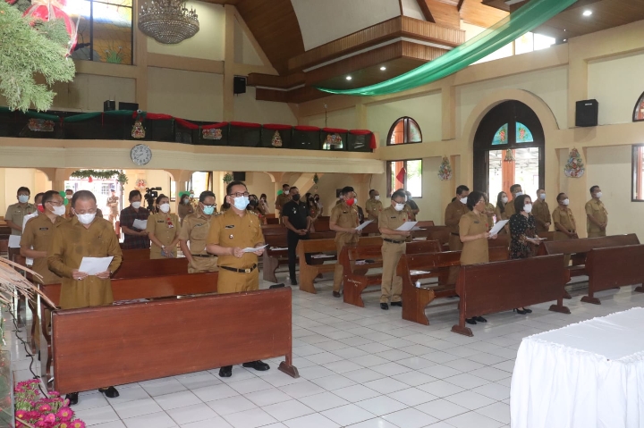 SWARAMEDIA-TOMOHON. Pemerintah Kota Tomohon menggelar Ibadah menyambut Natal Yesus Kristus yang dilaksanakan di Gedung Gereja GMIM Kakaskasen Pniel, pada senin 20 Desember 2021.