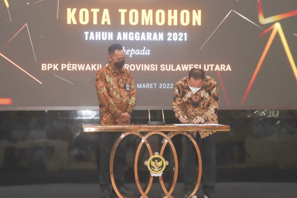 Walikota Tomohon menyerahkan LKPD Unaudited Tahun Anggaran 2021 kepada Kepala BPK Perwakilan Provinsi Sulawesi Utara. Sebelumnya Walikota Tomohon dan Kepala BPK Perwakilan Provinsi Sulawesi Utara menandatangani berita acara serah terima LKPD Unaudited Tahun Anggaran 2021.